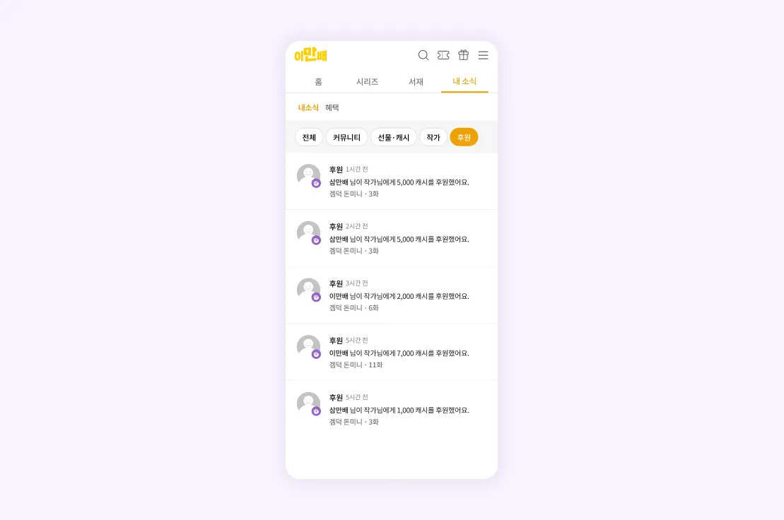 독자가 후원하면 홈 화면의 [내 소식] 탭에서 후원 댓글 알림을 별도로 받을 수 있어요.