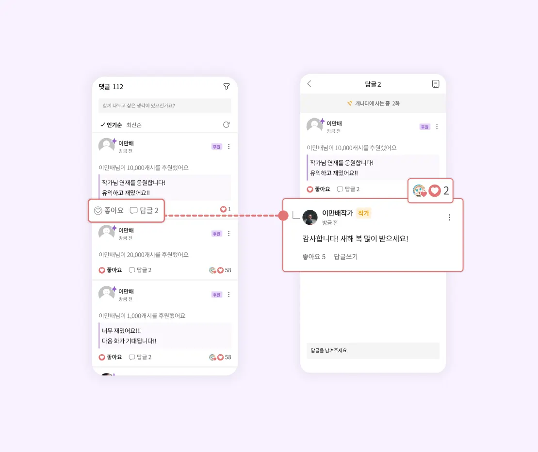 독자의 댓글에 작가님이 리액션하면 작가님이 반응한 댓글임을 알 수 있도록 사용성이 개선되었어요. 독자의 후원에 리액션으로 반응하면, 독자의 지속적인 후원 활동에 도움이 될 거예요.