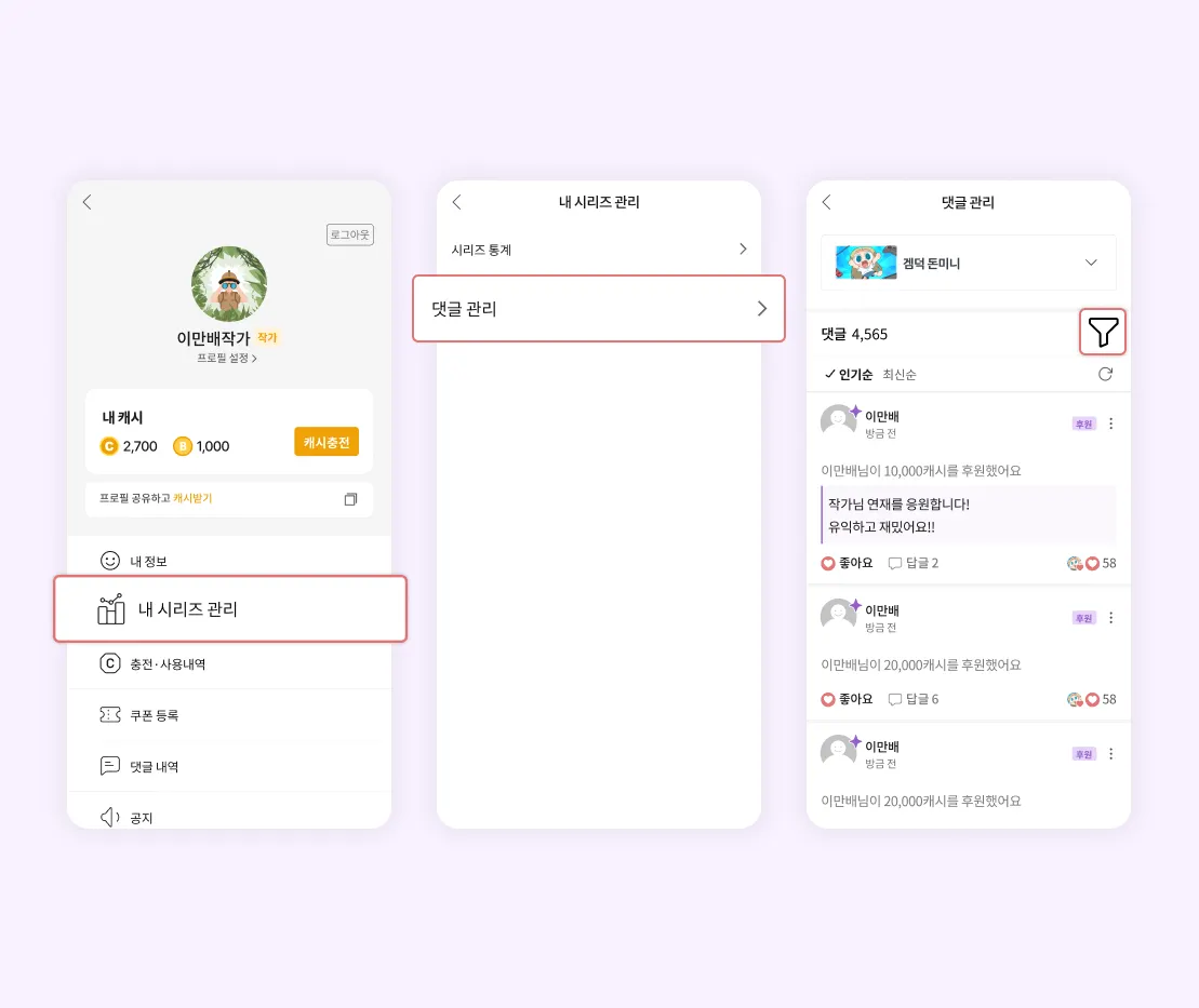 작가님이 손쉬운 사용을 위해 [댓글 관리] 기능을 신설했어요. [마이페이지] > [내 시리즈 관리] > [댓글 관리]에서 시리즈 별 후원 댓글만 조회하여 효율적으로 관리할 수 있어요.