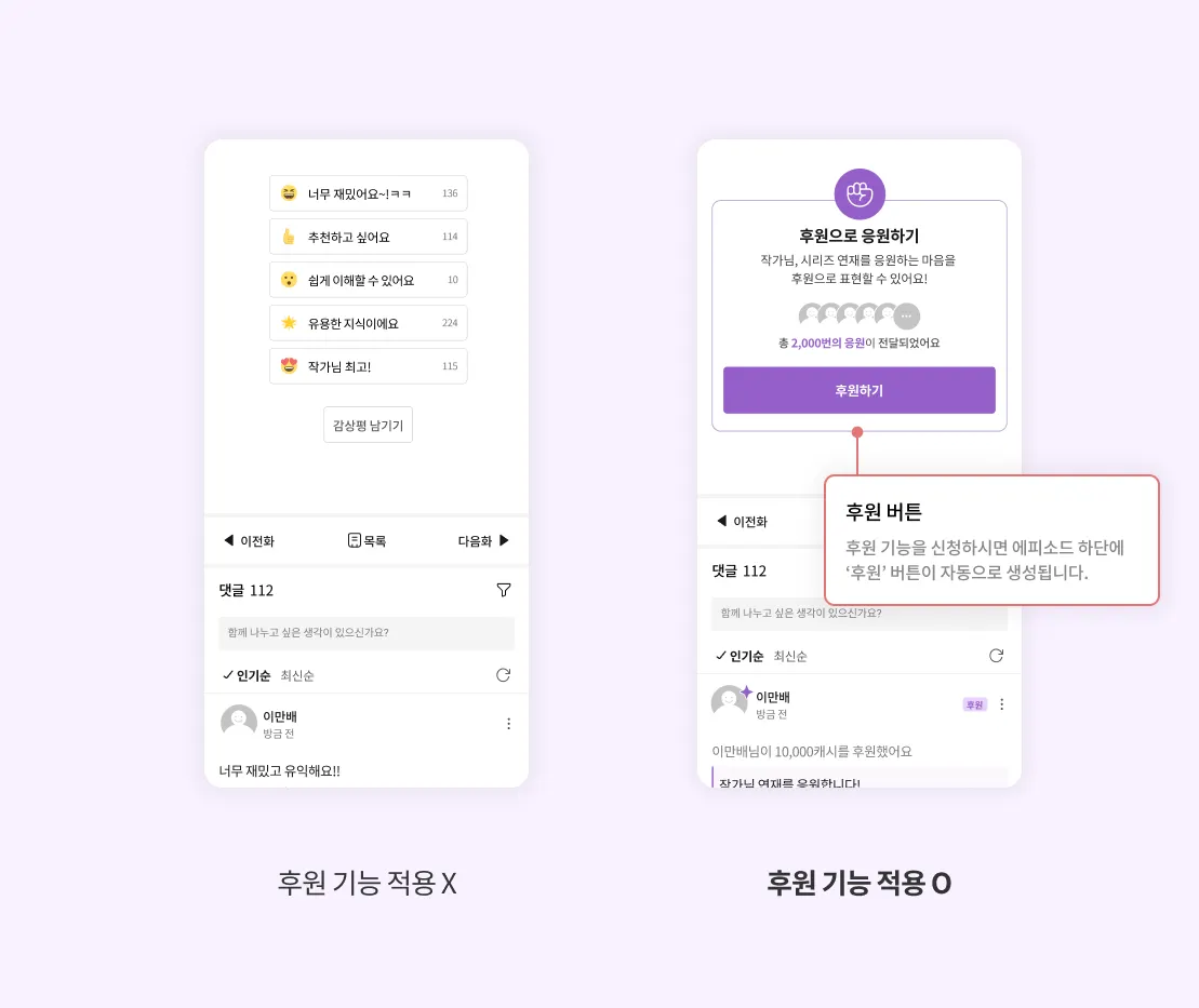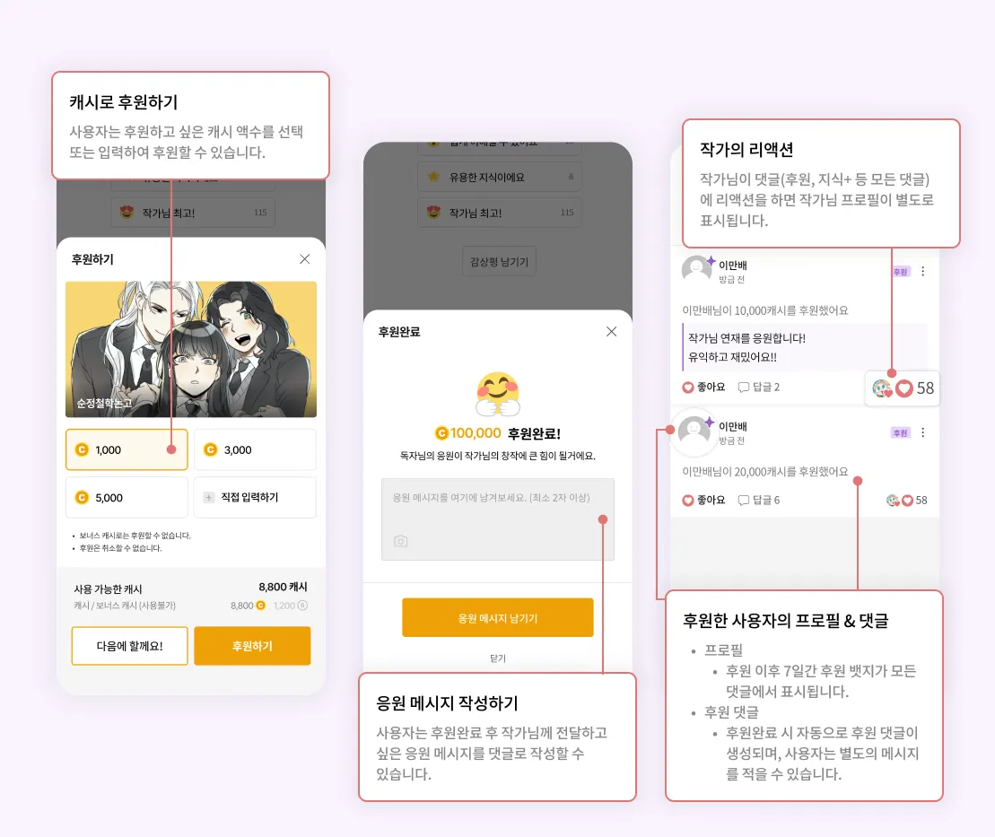 독자는 ‘캐시’로 후원할 수 있으며, 후원 완료 시 “[닉네임]님이 [후원액]캐시를 후원했어요”가 자동 댓글로 남겨집니다.